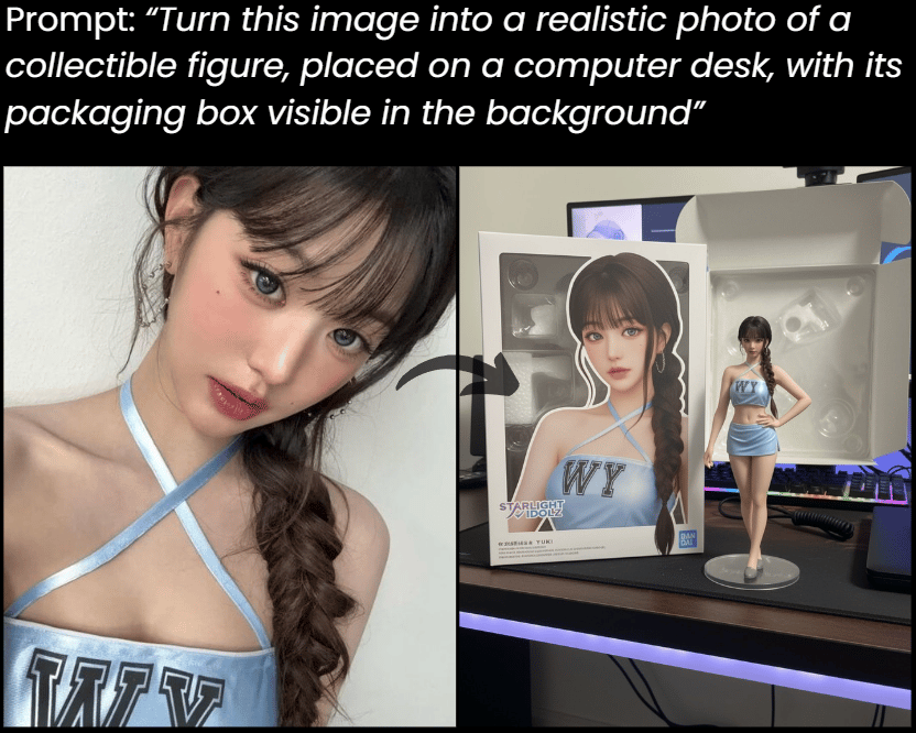 Creative Transformations: You can prompt it to restore an old, blurry photo to stunning quality or even turn a real person into a realistic 3D collectible figure.